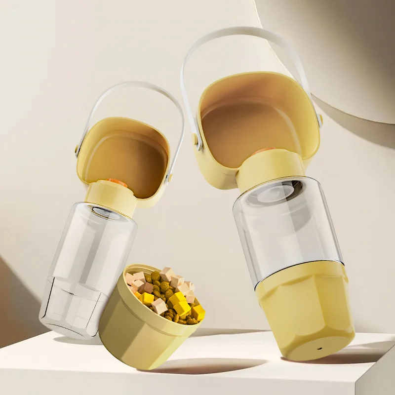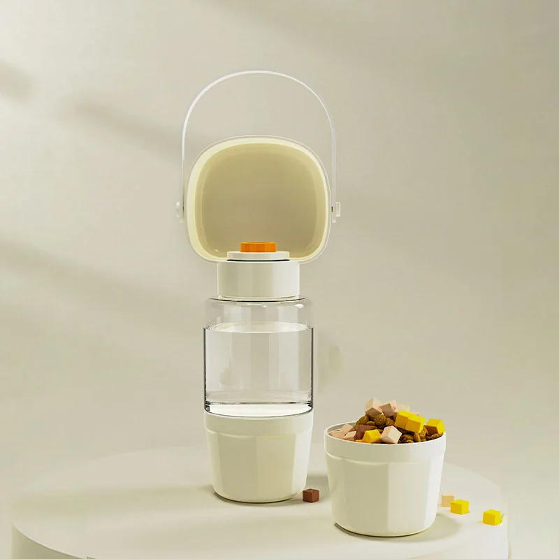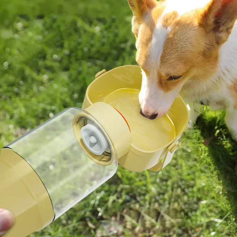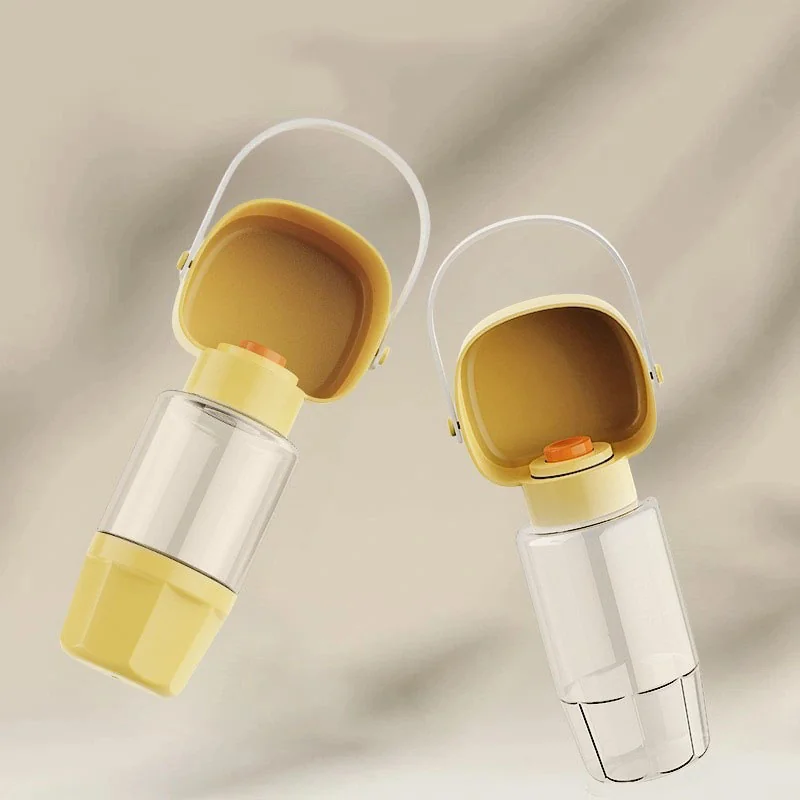 Botella portátil de agua para mascotas. Con botón liberador y bandeja integrada.